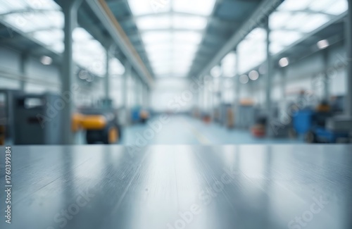 Blurred industrial facility interior. Metal surface in foreground. Factory environment production machinery visible. Workplace manufacturing tech, automation. Modern industrial space. Clean efficient