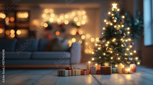 Blurred interior featuring a Christmas tree presents a sofa and a festively decorated living space illuminated with lights for the holiday season
