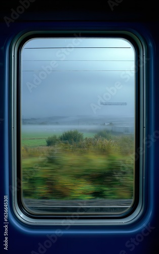 Blurred Landscape through Train Window Framed in Blue on a Cloudy Day with Mist and Motion