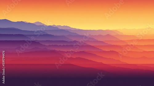 Blurred, layered mountain range, vibrant sunset colors