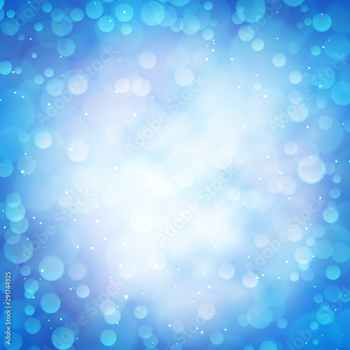Blurred light blue background with bokeh. Winter sky with snowfall glitter lights backdrop. Merry Xmas and Happy New Year. Abstract defocused wallpaper vector illustration. Festive luminous design