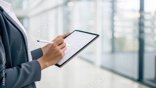 Blurred modern environment with professional using stylus to fill out digital form on tablet screen