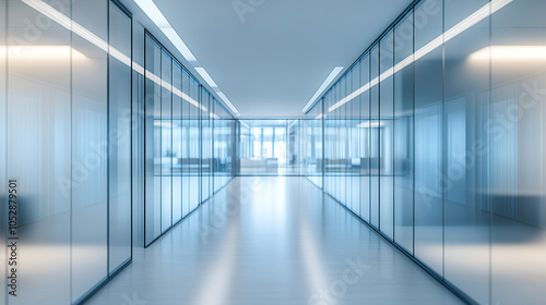 Blurred modern glass corridor in a business center, the interior of an office building with white walls and blue lights