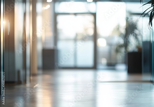 Blurred modern office interior background with soft bokeh lights, glass doors, and bright hallway, ideal for business concept banner, corporate design, or copy space layout