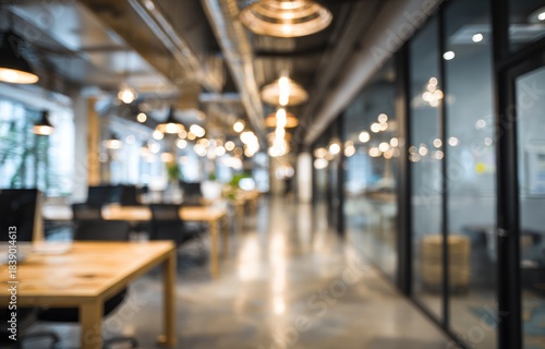 Blurred modern office interior with warm overhead lighting and wooden desks.