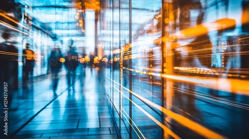 Blurred motion of people walking in a modern building corridor with glass walls.