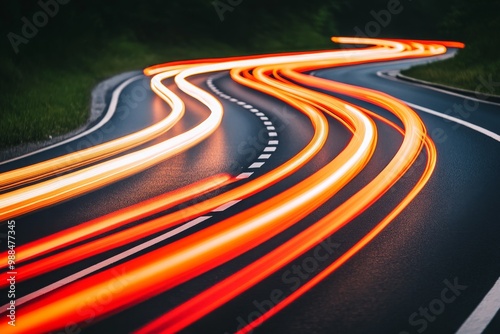 "Blurred Motion on a Curved Freeway: Long-Exposure Trails of Fast-Moving Cars at Night in an Urban Landscape"