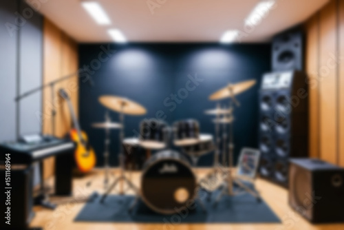 Blurred music studio interior, featuring musical instruments such as guitars and drums neatly lined up, modern classical theme, blurred music studio background.