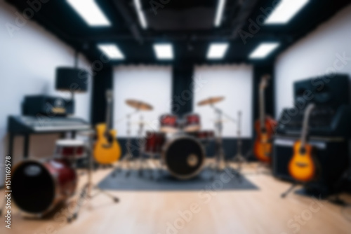 Blurred music studio interior, featuring musical instruments such as guitars and drums neatly lined up, modern classical theme, blurred music studio background.