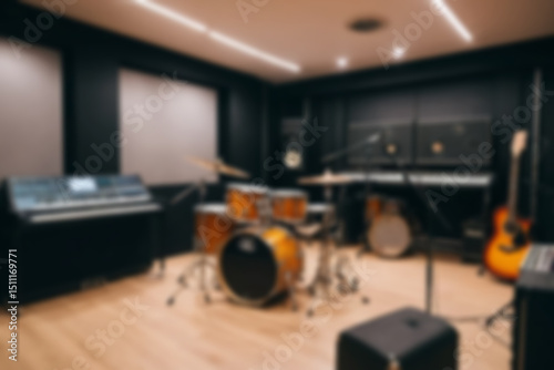 Blurred music studio interior, featuring musical instruments such as guitars and drums neatly lined up, modern classical theme, blurred music studio background.