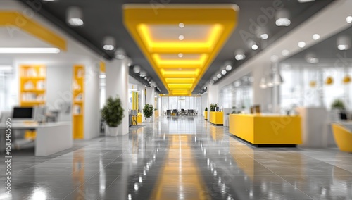 Blurred office interior background with a blurred door and glass wall, blurry bokeh light effect for a business concept design. High-quality photo, taken with a telephoto lens in realistic daylight.