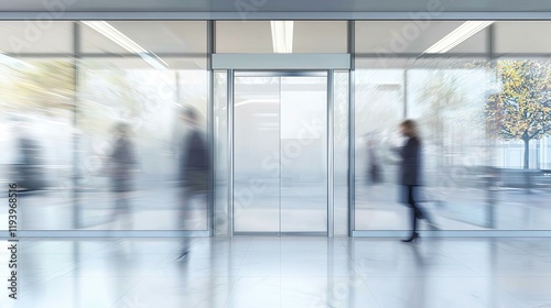 Blurred office interior background with a blurred door and glass wall, blurry bokeh light effect for a business concept design. High-quality photo, taken with a telephoto lens in realistic daylight.Ai