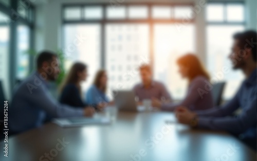 Blurred office interior space background with people working and meeting on table. Business concept. High quality