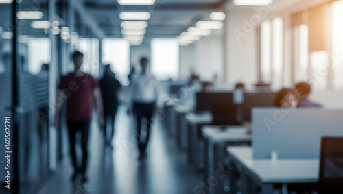 Blurred office interior with people walking and working at desks sunlight, capturing a busy atmosphere of productivity and motion in a bright modern workplace filled with natural energy.