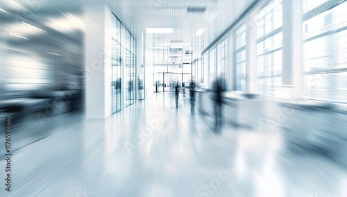 Blurred office interior with white walls and light yellow accents, blurred people working in the background, creating an abstract business concept.