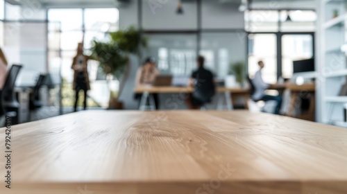 Blurred office space with people and an empty wooden desk in the foreground AI Generative.
