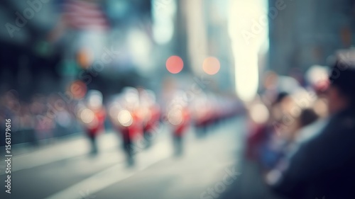 Blurred parade marchers in vibrant splendor, echoing the spirited beats of National Independence Day; urban symphony, communal exuberance