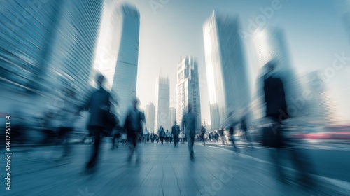 Blurred people walk in a city street with tall buildings in the background.