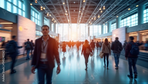 Blurred people walk through large exhibition hall. Busy expo center with many people. Interior view of trade show. Plenty of visitors, exhibitors. Modern, international business event. Crowd in