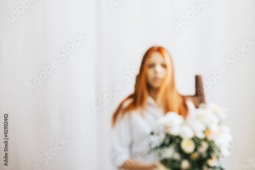 blurred portrait teenage girl in denim shorts and a white shirt stands with a bouquet of flowers in a studio decorated with retro-style flowers, a concept of spring and floral compositions