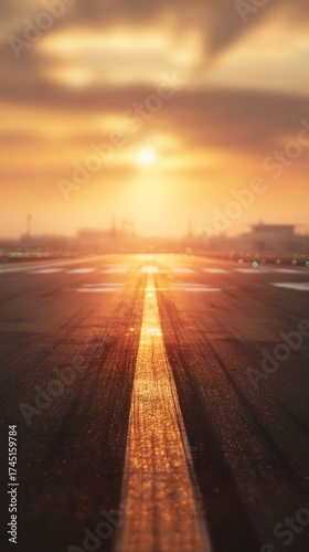 Blurred runway background under golden sunrise, faint airplane silhouette ready for takeoff, mood of progress and new beginnings, cinematic depth with wide copy space.