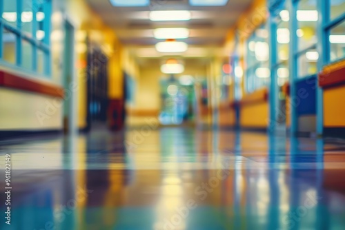 Blurred school classroom background, soft abstract focus on desks and learning space.