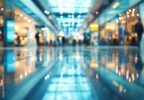 Blurred shopping mall interior with reflective floor showing colorful lights, warm-lit storefronts and moving figures.