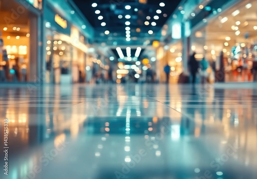 Blurred shopping mall interior with reflective floor showing colorful lights, warm-lit storefronts and moving figures.