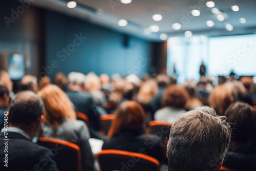 Blurred shot of an audience in a conference room, facing a presenter on stage