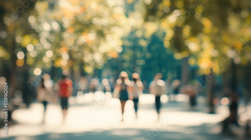 Blurred silhouettes of individuals walking in a sunlit park surrounded by vibrant green trees creating a serene and tranquil atmosphere