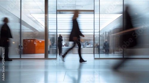 Blurred silhouettes of people stride through a modern, glass-enclosed space, conveying motion and urban rhythm.