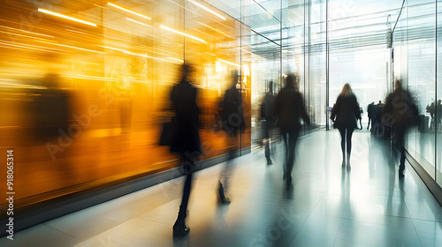 Blurred silhouettes of people walking in a modern building.