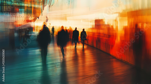 Blurred silhouettes of people walking in a modern city hallway - photo. Movement - River. Illustration