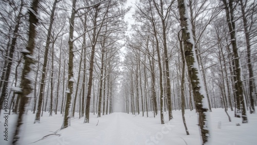 Blurred snowy forest backdrop depicting a chilly winter environment