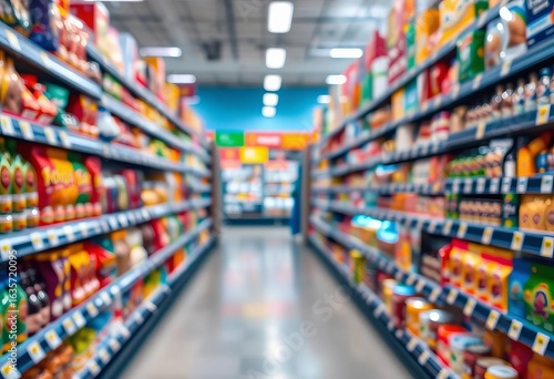 Blurred supermarket aisle with product shelves, colorful packaging visible, cans, blur