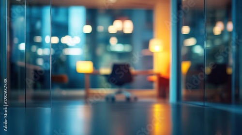 Blurred view of a modern office at night, showing desks, chairs, and warm lighting through glass partitions.