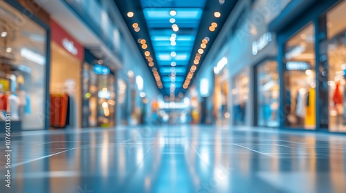 Blurred view of a shopping mall with tiled floor and bright lights.