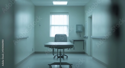 Blurred view of empty medical room with focus on table and window from patient’s chair
