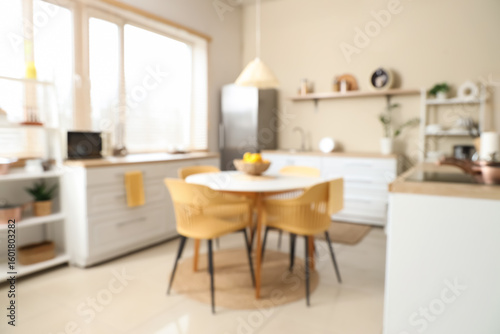 Blurred view of kitchen with dining table, counters and shelf units