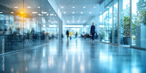 Blurred View of Modern Office Space Featuring People Working Behind Glass Walls in a Dynamic Corporate Environment