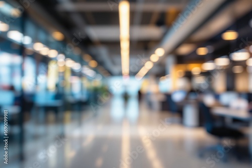 Blurred view of modern open office with bright lighting, creative style, glass walls and desks, bright background. Concept of corporate work environment. Ai generative