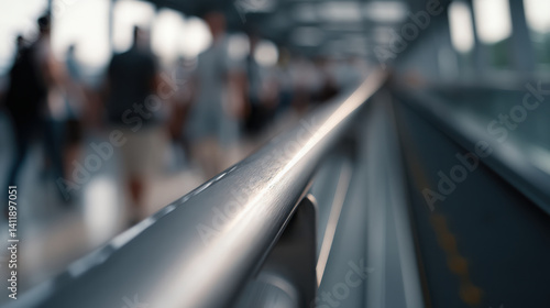 Blurred view of people walking along modern escalator handrail in busy urban setting