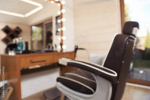 Blurred view of stylish hairdresser's workplace with professional armchair in barbershop