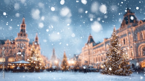 Blurred winter wonderland background with sparkling snow and glowing lights.