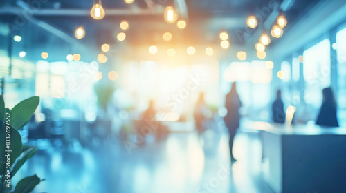 Blurry corporate workspace with soft lighting and minimal furniture showcasing distant silhouettes of people
