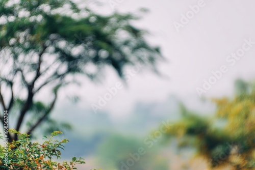 Blurry, dreamlike landscape showcasing green trees against a soft, ethereal backdrop, evoking a sense of peace and tranquility