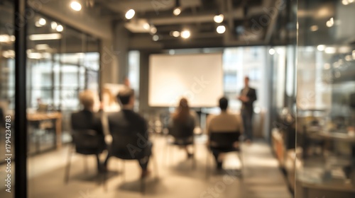 Blurry Office Presentation Area - Soft-focus image of an office presentation area with people and equipment. High quality