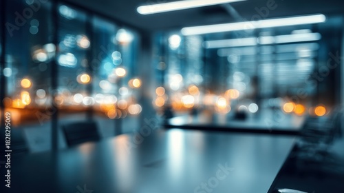Blurry Office Workspace at Night Reflecting Modern Design With Dim Lighting and Urban Vibes