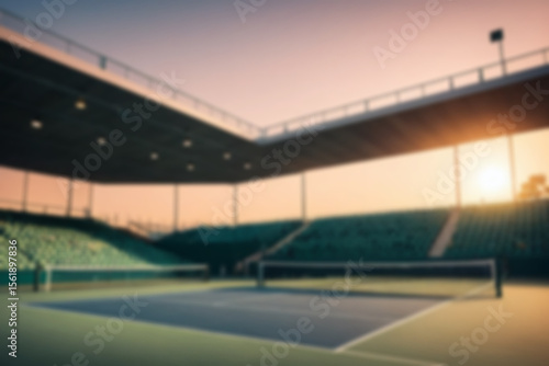 Blurry photo of tennis court with magnificent stadium, there are empty spectator seats, modern theme, sports.