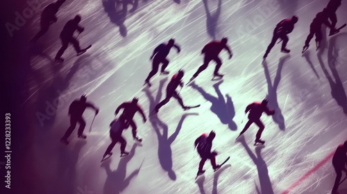 Blurry silhouettes of ice skaters gliding swiftly across the ice